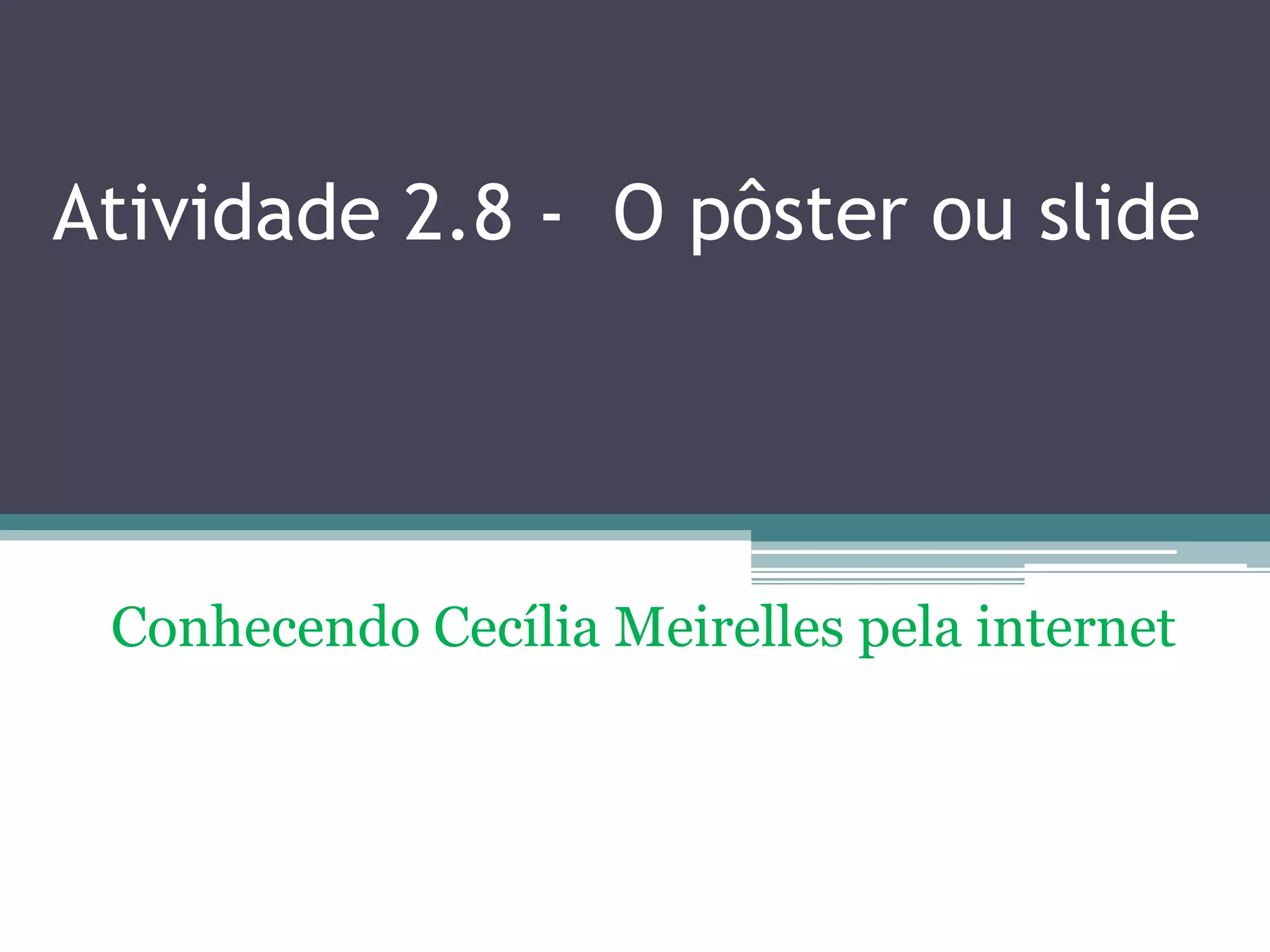 O documento descreve uma atividade para estudantes conhecerem a escritora brasileira Cecília Meirelles através de pesquisas na internet. Os alunos serão divididos em grupos para pesquisar a biografia, obras e poesias da autora no site indicado. Eles compartilharão seus achados em sala de aula e comentarão os trabalhos dos colegas. O resultado será postado online para receber comentários adicionais.