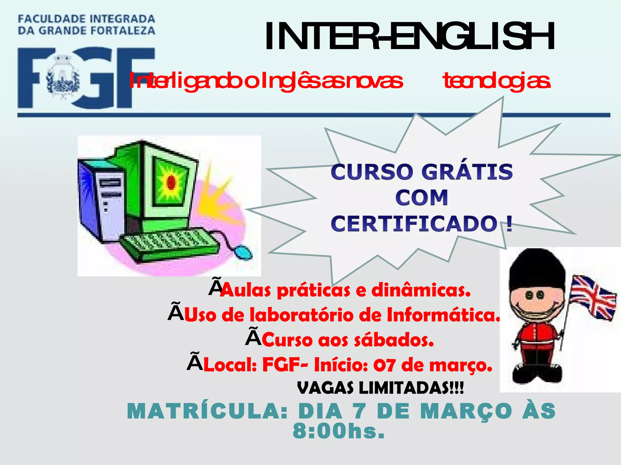 Este documento descreve um curso de inglês aos sábados que utiliza blogs e laboratórios de informática para ensinar inglês de forma prática e dinâmica. O curso visa desenvolver a leitura, escrita e interação em blogs em inglês, despertando o interesse dos alunos pela língua em um ambiente colaborativo e motivador.