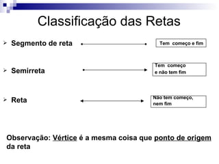 O documento explica o que é um ângulo, como são classificados e medidos. Um ângulo é formado por duas semirretas que têm o mesmo ponto de origem. Ângulos podem ser agudos, retos ou obtusos dependendo da abertura entre as semirretas. Eles são medidos em graus usando um transferidor, com um grau correspondendo a 1/180 de um ângulo reto.