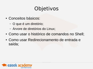 O documento discute introdução ao Linux, incluindo hierarquia de diretórios, caminhos absolutos e relativos, histórico de comandos, e redirecionamento de entrada e saída. É explicado que diretórios organizam arquivos e programas, e que caminhos absolutos começam com / enquanto caminhos relativos referem-se à localização atual. Comandos como ls, cat, head e tail são usados para listar e visualizar arquivos, enquanto redirecionamento direciona saída de comandos para arqu
