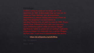 Um blog é um tipo de diário online, onde conteúdos como textos, imagens e vídeos são publicados regularmente. O termo blog surgiu a partir da simplificação de weblog, e sua popularização ocorreu no início dos anos 2000 com a introdução de recursos como links permanentes e comentários. Atualmente, existem cerca de 112 milhões de blogs, com um processo de criação simplificado que inclui escolher um assunto e um tema visual.