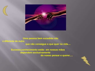 O documento discute como o sucesso, conhecimento e pensamento positivo estão interligados. Ele afirma que o sucesso depende do nosso pensar e querer e não de fatores externos. Também diz que devemos usar ambos os lados do cérebro e enxergar oportunidades ao nosso redor. Conclui afirmando que manter sonhos e pensamentos positivos nos eleva a lugares desejados.