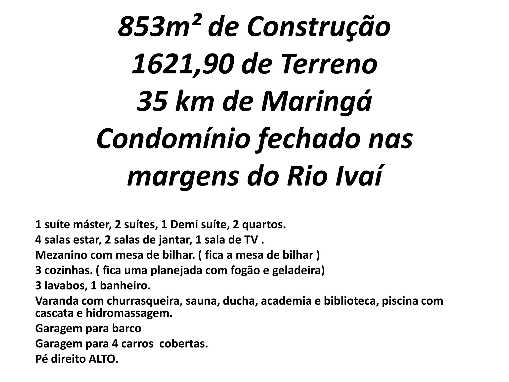 Uma casa de 853m2 construídos e 1621,90m2 de terreno a 35km de Maringá, com suítes, quartos, salas de estar e jantar, mezanino com mesa de bilhar, 3 cozinhas, lavabos, banheiro, varanda com churrasqueira, sauna, academia, biblioteca e piscina com cascata e hidromassagem. Inclui também garagem para barco e para 4 carros.