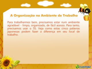 O documento discute como o método 5S (Seiri, Seiton, Seiso, Seiketsu, Shitsuke) pode ser aplicado no ambiente de trabalho para melhorar a organização e produtividade. Ele explica que um local de trabalho organizado afeta positivamente o rendimento e moral dos funcionários, permitindo que eles encontrem itens com mais facilidade e trabalhem de maneira mais animada.