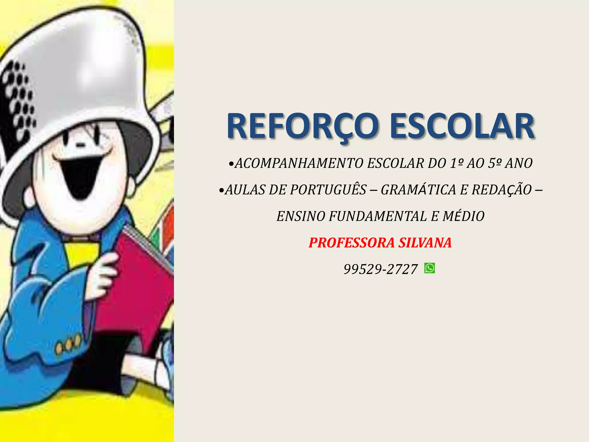 Oferece aulas de reforço escolar para alunos do 1o ao 5o ano do ensino fundamental, com foco em Português, Gramática e Redação. A professora Silvana ministra as aulas e pode ser contatada pelo telefone 99529-2727.
