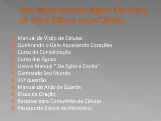 Este slide apresentaalgunsdos livros da VinhaEditorasobre Células.Manual da Visão de CélulasQuebrando o Gelo Aquecendo CoraçõesCurso de ConsolidaçãoCurso das ÁguasLivro e Manual “ Do Egito a Canãa“Ganhando Seu Mundo11ª questãoManual do Anjo da GuardaDisco de OraçãoReceitas para Comunhão de CélulasPassaporte Escola de Ministério