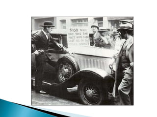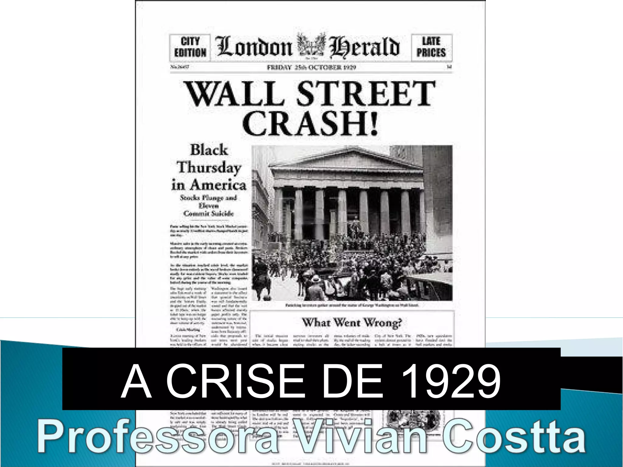 A crise de 1929 foi causada por inovações tecnológicas e crescimento financeiro que não foram acompanhados por aumentos no consumo, levando à falência de empresas e bancos. Isso causou desemprego em massa, fome e miséria em todo o mundo. Os Estados Unidos implementaram o New Deal para enfrentar a crise por meio de obras públicas e proteção social.