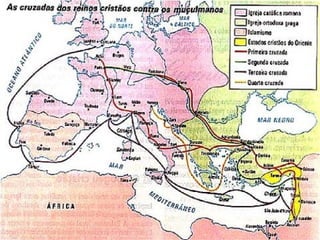 O documento descreve as Cruzadas e a crise do feudalismo durante a Idade Média. As Cruzadas surgiram para aliviar a pressão demográfica na Europa e expandir o cristianismo, mas também levaram ao renascimento das cidades e do comércio através da reabertura do Mediterrâneo ao comércio europeu. Isso enfraqueceu o poder dos senhores feudais e contribuiu para o surgimento da burguesia.