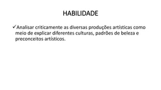 O documento resume as principais características artísticas do antigo Egito e da Grécia Antiga, incluindo a arte egípcia como hieróglifos, pinturas em tumbas, e as pirâmides. Também descreve a arte grega como o naturalismo nas esculturas e a representação da mitologia na cultura.