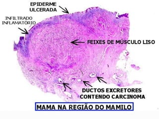 A doença de Paget é uma condição rara que afeta os ossos, mama e regiões extramamárias. Pode causar deformidades ósseas, dor e fraturas frequentes. Na mama, manifesta-se como erupção no mamilo e aréola. Extramamariamente, ocorre mais em regiões com glândulas apócrinas como vulva, escroto e região perianal. O diagnóstico é feito por exames de imagem, laboratoriais e biópsia da lesão. O tratamento varia de acordo com a localização