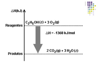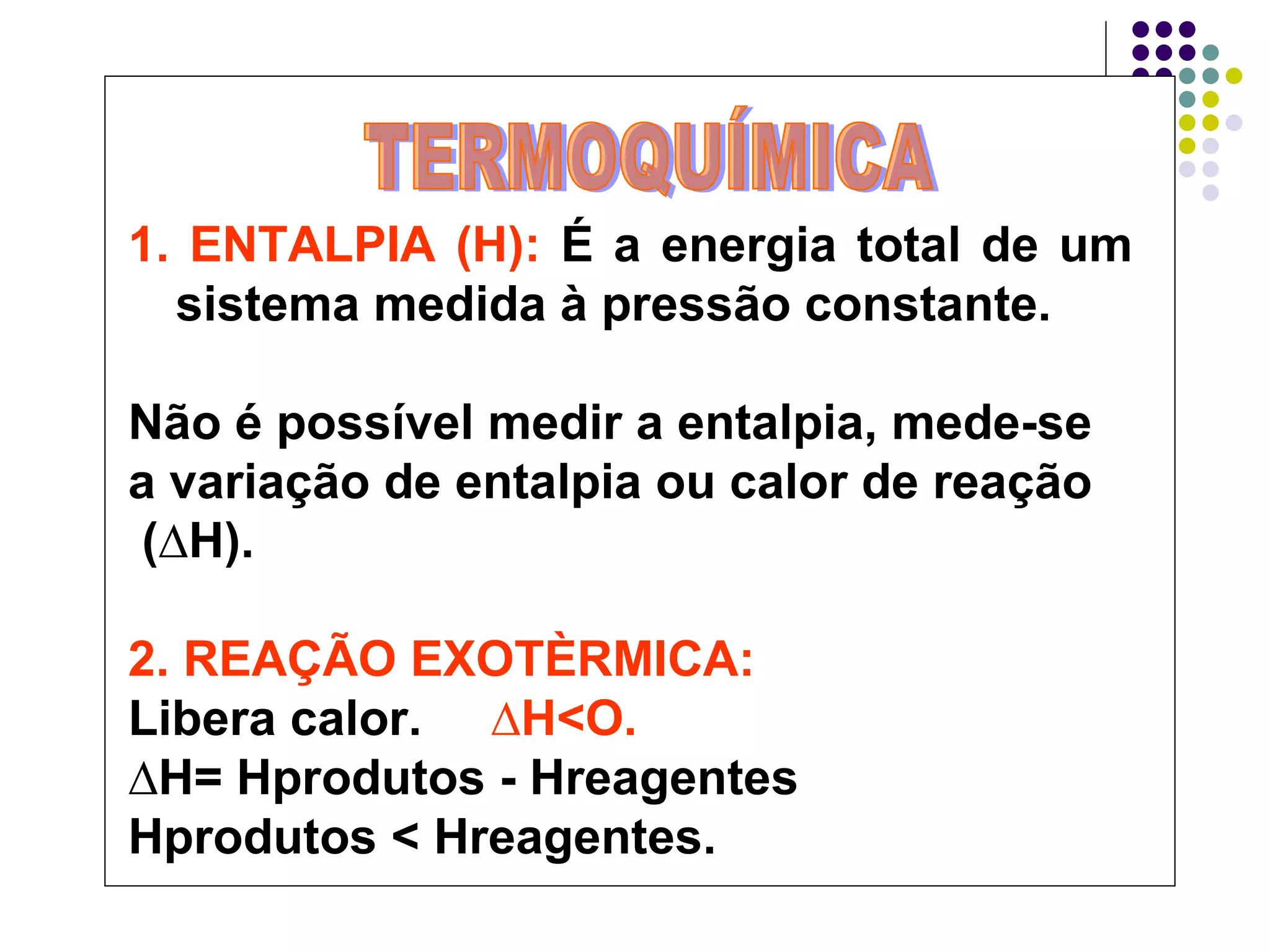 1) A entalpia (H) é a energia total de um sistema medida à pressão constante e não pode ser medida diretamente, apenas a variação de entalpia (ΔH).