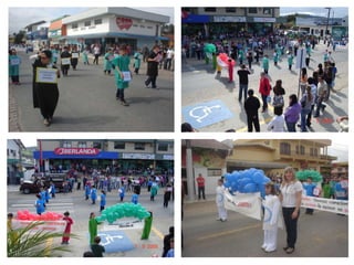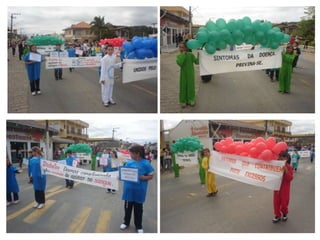 O documento descreve um projeto realizado em uma escola sobre diabetes, incluindo: 1) Uma pesquisa com alunos sobre doenças comuns e casos de diabetes; 2) Informações sobre o que é diabetes, sintomas e fatores de risco; 3) Dados sobre portadores de diabetes na escola, município e estado.