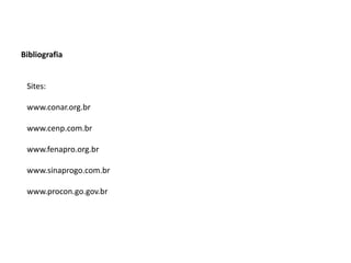 O documento apresenta uma bibliografia com livros e sites relacionados a publicidade, direito do consumidor e legislação. Também traz informações sobre órgãos como CONAR, CENP, FENAPRO e SINAPRO, além de resumir direitos garantidos pelo Código de Defesa do Consumidor. Por fim, fornece dicas para realizar compras online de forma segura.