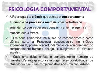 Este documento discute brevemente a psicologia comportamental e seu fundador John B. Watson. Apresenta também alguns princípios-chave da aprendizagem comportamental e discussões sobre drogas e família na sociedade.
