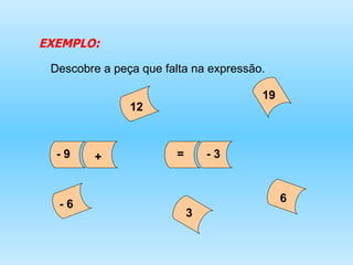 - 9 + 12 = 3 , não serve! - 9 + 3 = - 6 , não serve! - 9 + (- 6) = - 9 - 6 = - 15 , não serve! - 9 + 6 = - 3. É o número 6! RESPOSTA: A peça que falta é o número 6. Vamos substituir o valor de cada peça, no espaço em branco, e verificar qual é a peça que torna a igualdade verdadeira.