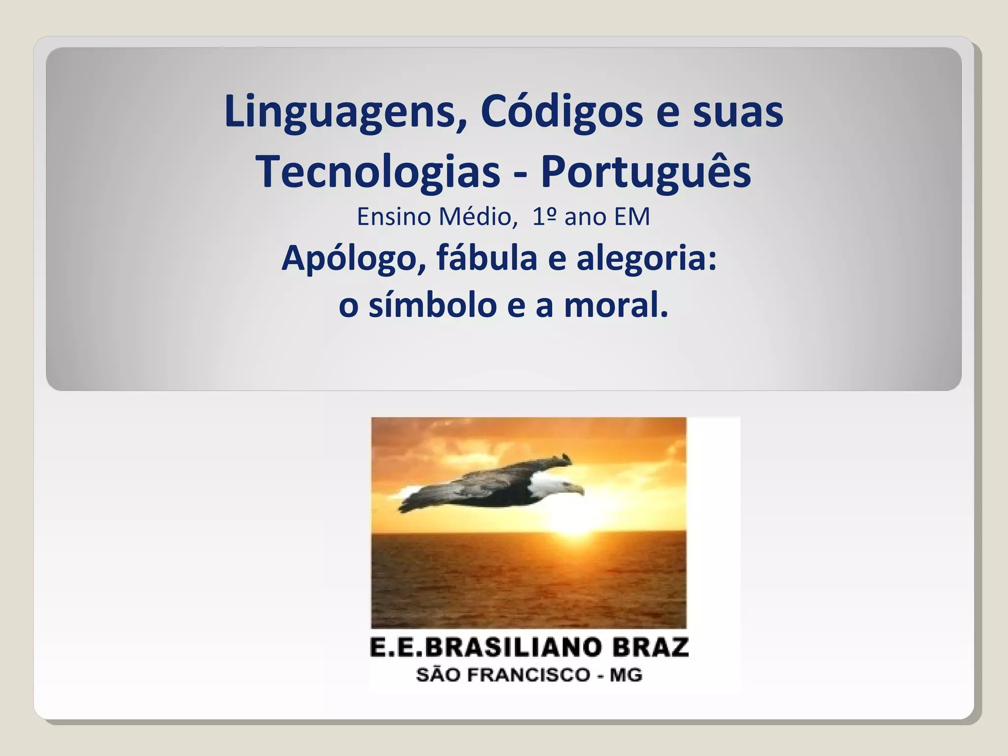 O documento discute apólogos, fábulas e alegorias, definindo cada um e fornecendo exemplos. As fábulas são definidas como narrativas curtas que usam animais como personagens para ensinar lições morais de forma indireta. Grandes fabulistas como Esopo, Fedro e Jean de La Fontaine popularizaram o gênero. Alegorias representam significados adicionais através de símbolos, como o Mito da Caverna de Platão. Apólogos ilustram lições de sabedoria usando personagens diversos