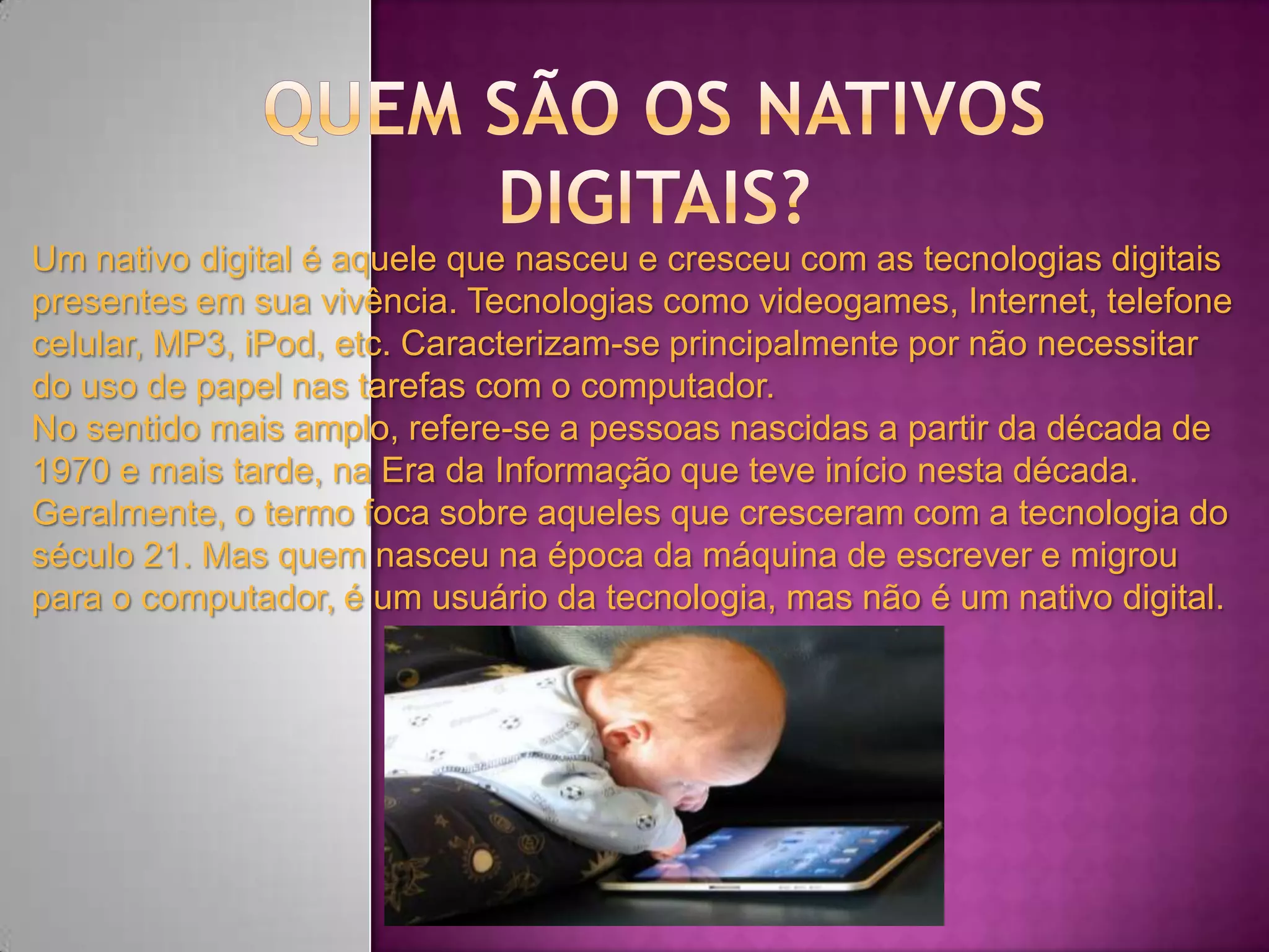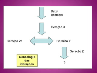 O documento discute as gerações nativas digitais, começando pela Geração X nascida entre 1960-1980, seguida pela Geração Y nascida entre 1980-2000, e então a Geração Z nascida a partir de 1990, caracterizada por estarem sempre conectados através de dispositivos móveis.