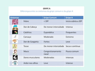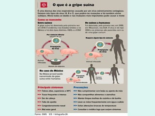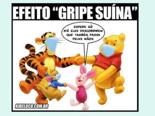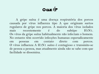 O documento descreve a gripe suína, incluindo sua origem, sintomas, formas de contágio e prevenção. Ele fornece dados atualizados sobre o número de casos e mortes no Brasil e no mundo.