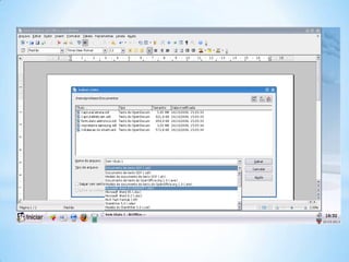 Este documento fornece instruções sobre como usar o software de processamento de texto BrOffice Writer. Ele explica os principais componentes da interface do usuário e como criar, formatar, salvar e imprimir documentos. Também discute como inserir capitulares e configurar as páginas de um documento. O documento visa capacitar professores e funcionários administrativos no uso do BrOffice Writer.