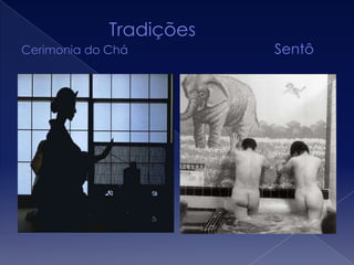 O documento discute as principais religiões e setores econômicos do Japão. Ele lista o xintoísmo, budismo e cristianismo como as principais religiões, e descreve os setores primário, secundário e terciário da economia japonesa.