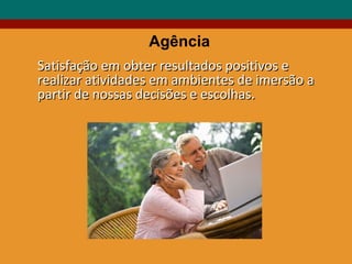 O documento discute a noção de agência em ambientes narrativos e de imersão, distinguindo agência da interatividade. Também aborda formas expressivas como hipertextos narrativos pós-modernos e labirintos ficcionais que podem promover a agência ao darem liberdade de interpretação ao leitor/jogador.