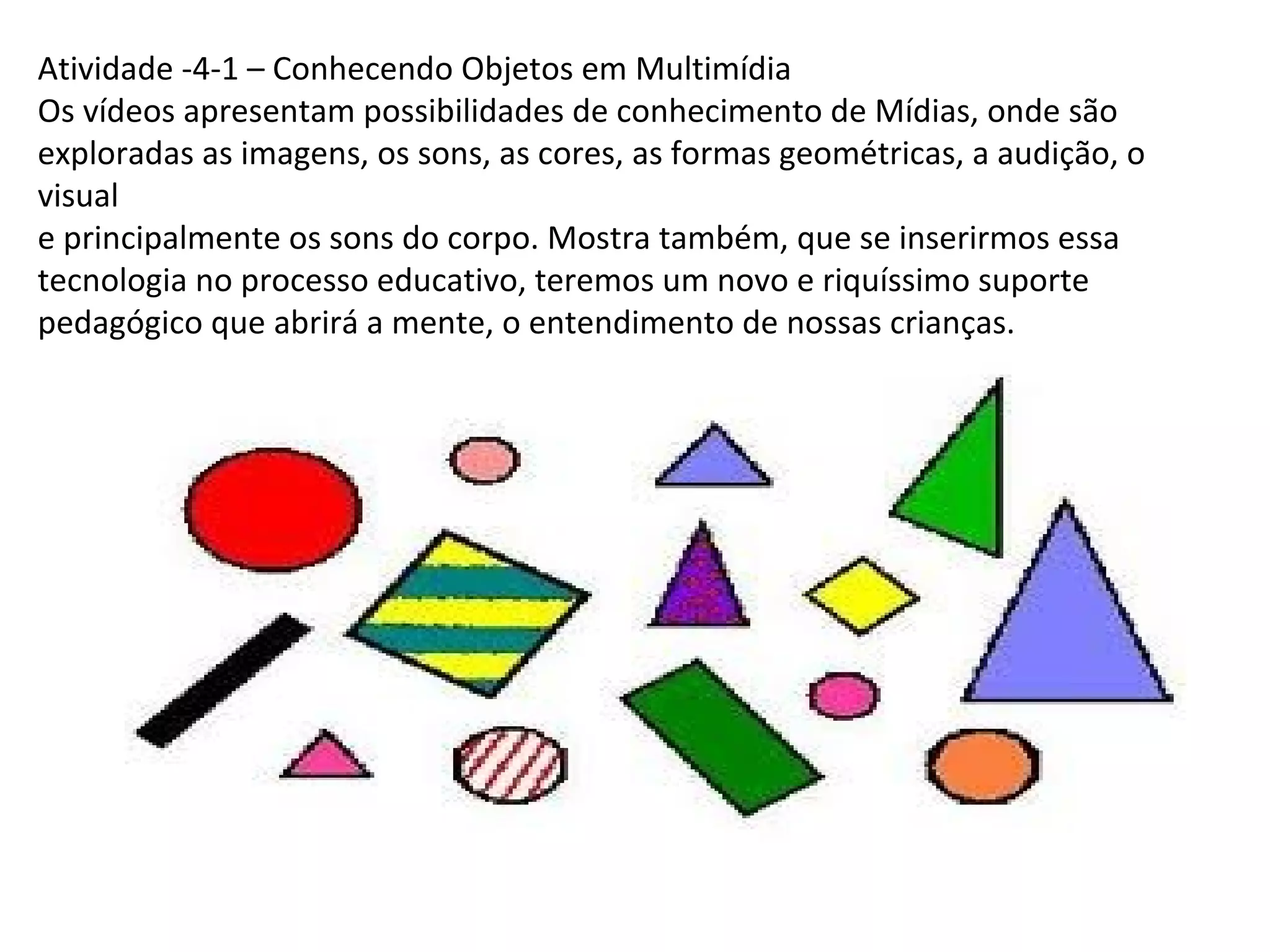 O documento discute como vídeos e multimídia podem ser usados para que crianças conheçam objetos através de imagens, sons, cores e formas. Ele também argumenta que a tecnologia e multimídia, quando usadas no processo educativo, podem fornecer um valioso suporte pedagógico que abrirá a mente e aumentará a compreensão das crianças.
