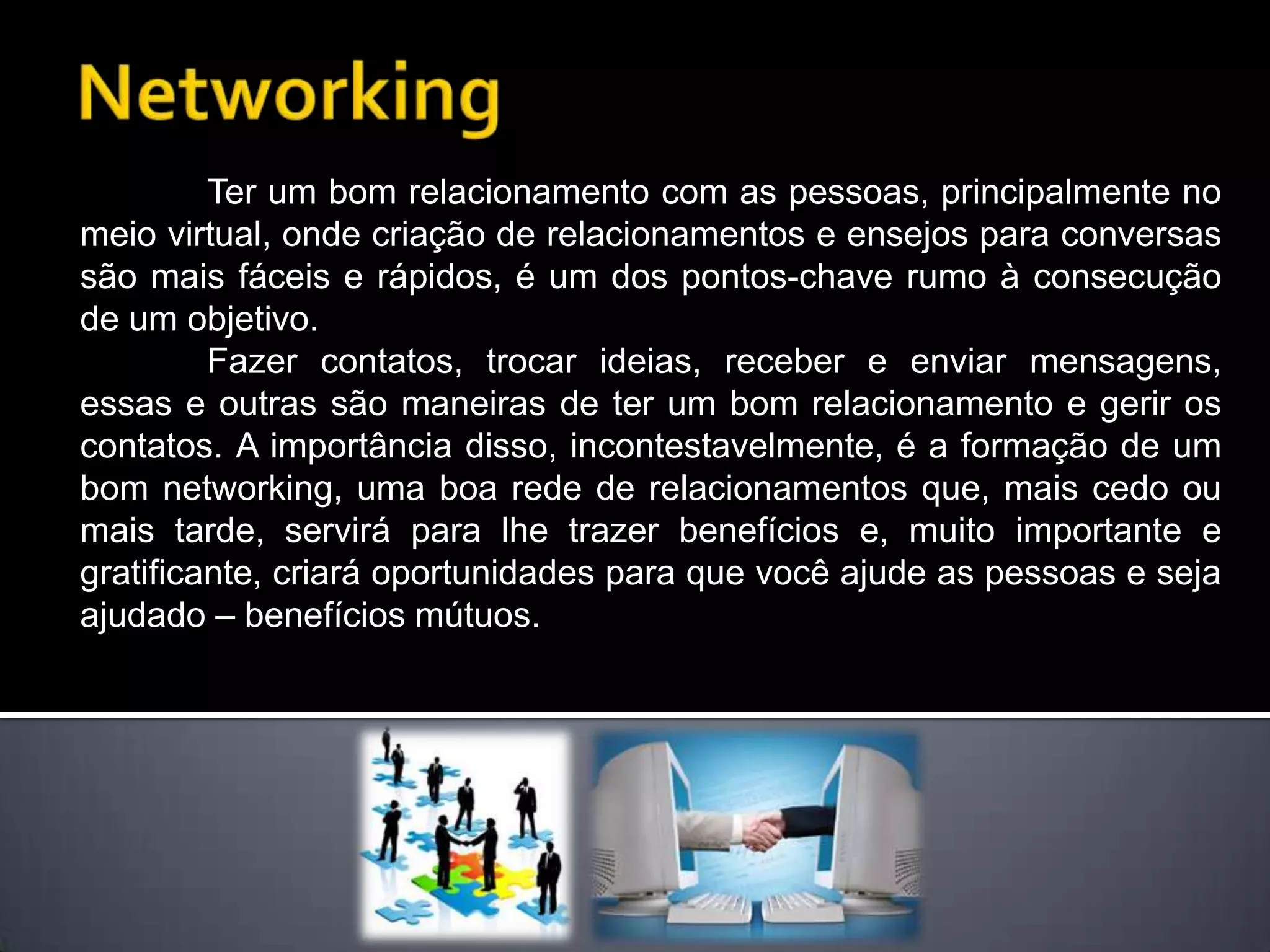 O documento discute a importância de se construir uma boa rede de relacionamentos, chamada de networking, para o sucesso profissional e alcance de objetivos. Ter contatos em potencial que possam oferecer oportunidades no futuro é um dos principais benefícios de se dedicar ao networking. O documento também destaca que embora o networking online seja mais fácil de ser construído, leva tempo para desenvolver relacionamentos de qualidade.