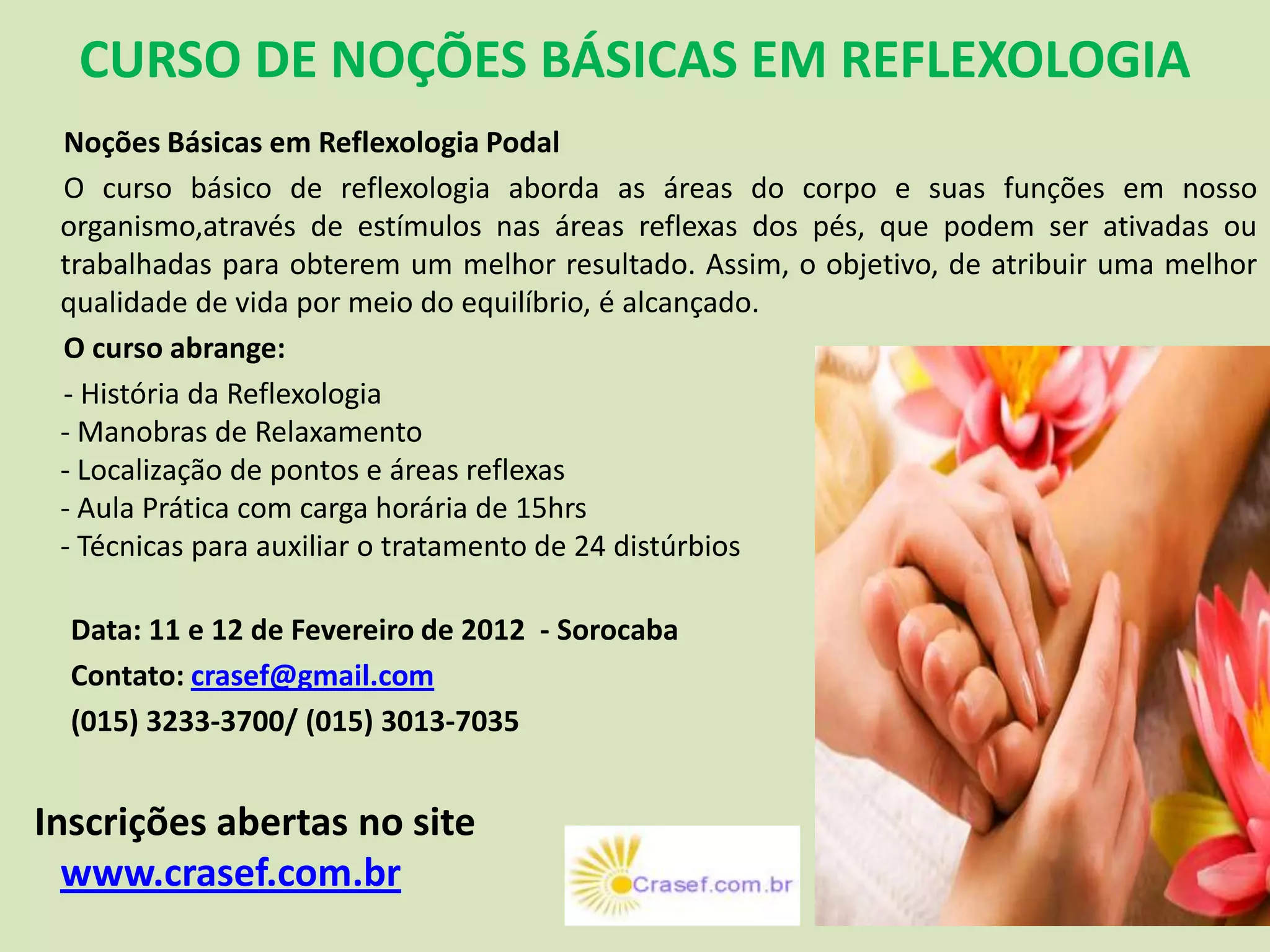 O curso de Noções Básicas em Reflexologia aborda a relação entre as áreas do corpo e os pés, ensinando como estimular áreas reflexas dos pés para melhorar a saúde e qualidade de vida. O curso de 15 horas inclui a história da reflexologia, técnicas de relaxamento, identificação de pontos nos pés e prática para tratar 24 distúrbios.