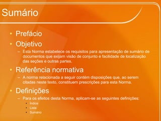 Este documento estabelece os requisitos para a apresentação de sumários em documentos, definindo seu objetivo, referências normativas, definições, localização dentro do documento e regras gerais de apresentação.