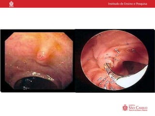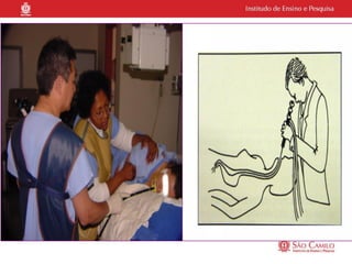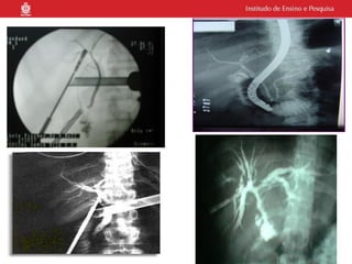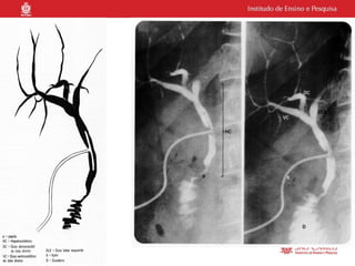 O documento descreve indicações para exames de imagem de ductos biliares, incluindo colangiografia retrógrada endoscópica para pacientes com cálculos migrados da vesícula biliar ou pacientes ictéricos. Ele também menciona radiografia piloto, uso de contraste hidrossolúvel e que o procedimento é realizado por um médico gastroendoscopista.