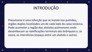 O documento fornece informações sobre pneumonia, incluindo sua definição, etiologia, tipos, sintomas, prevenção, diagnóstico e tratamento. A pneumonia é uma infecção pulmonar que pode ser causada por bactérias, fungos ou vírus e pode ser adquirida no hospital ou na comunidade. Os principais sintomas incluem tosse, febre e dificuldade para respirar. O diagnóstico envolve exame físico, radiografia de tórax e testes laboratoriais. A prevenção inclui vacinação e