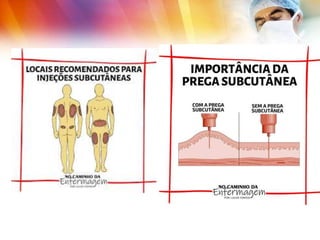 O documento discute as diferentes vias de administração de medicação, incluindo punção venosa periférica. Ele descreve os materiais utilizados, tipos de seringas e agulhas, técnicas para injeções intradérmicas, intramusculares, subcutâneas e intravenosas, além de observações importantes sobre cada procedimento.