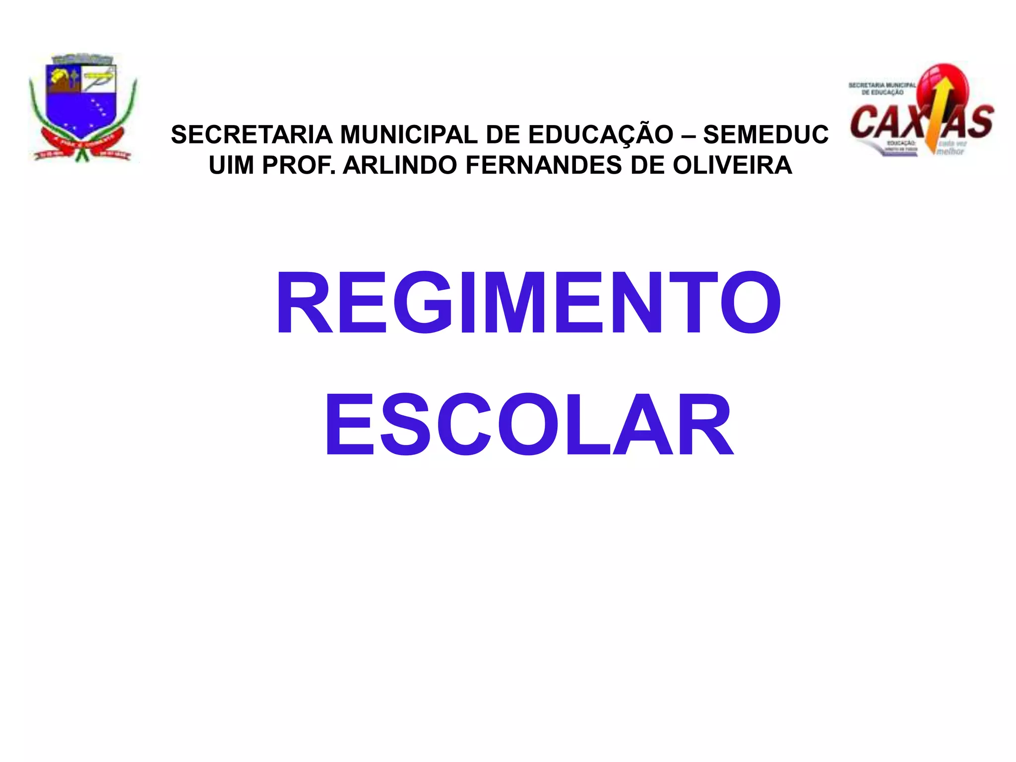O documento descreve o regimento escolar de uma escola municipal, definindo sua estrutura organizacional e equipes. Ele estabelece o Conselho Escolar, o Grêmio Estudantil e outras entidades, além de definir direitos e deveres da comunidade escolar. O regimento é composto por títulos e capítulos tratando de disposições preliminares, organização escolar, direitos e deveres.