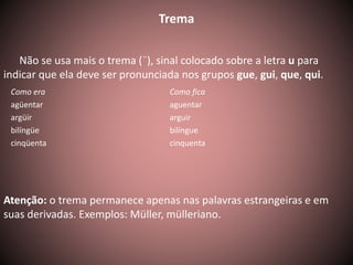 1. O documento descreve as principais mudanças nas regras de acentuação grafica da língua portuguesa de acordo com o Novo Acordo Ortográfico. 2. Algumas dessas mudanças incluem a remoção do trema em certas palavras e a remoção de acentos em ditongos, vogais tônicas e palavras terminadas em determinados sons. 3. O documento também discute o uso do hífen em palavras compostas de acordo com as novas regras ortográficas.
