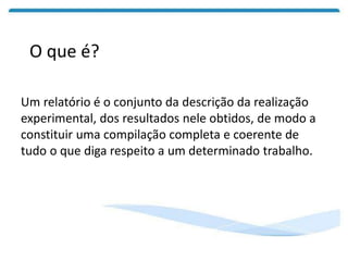 O documento define o que é um relatório e sua estrutura padrão. Um relatório descreve experimentos realizados, resultados obtidos e conclusões de forma clara para que outros possam reproduzir. Um relatório típico contém seções como introdução, objetivo, métodos, desenvolvimento, resultados, conclusão e referências/anexos.