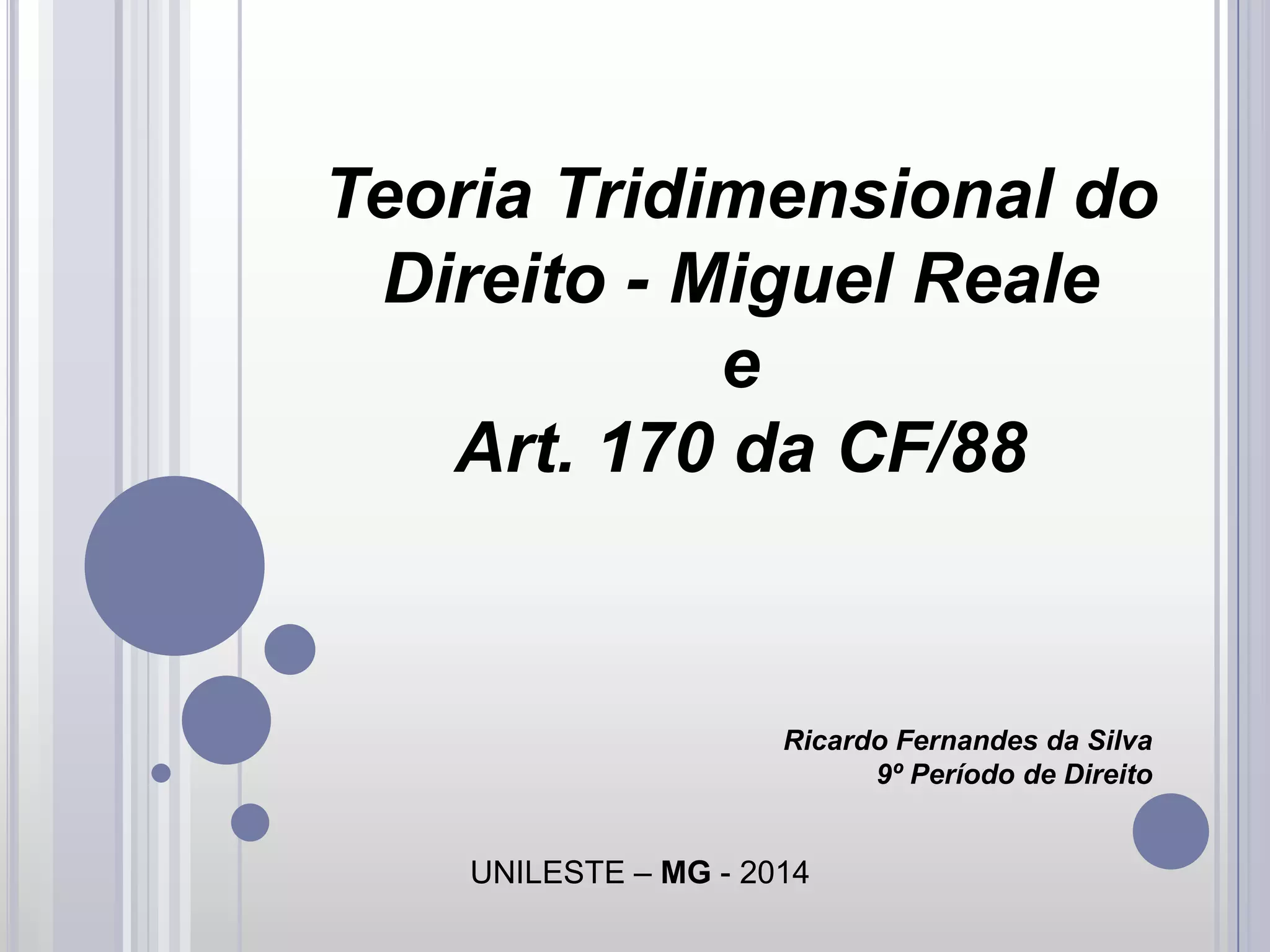 O documento discute a Teoria Tridimensional do Direito de Miguel Reale, que vê o direito como composto por Fato, Valor e Norma. Também analisa o Artigo 170 da Constituição Federal de 1988, que estabelece os princípios da ordem econômica brasileira como Soberania Nacional, Propriedade Privada, Livre Concorrência e outros. Conclui que a teoria influenciou o Código Civil brasileiro ao estabelecer uma disciplina jurídica tridimensional de direitos humanos.