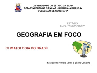 [1] O documento apresenta os principais elementos do clima como pressão, temperatura e umidade e fatores como latitude, relevo, maritimidade e correntes marítimas. [2] Explora os tipos climáticos do Brasil formados pelas massas de ar equatorial, tropical e polar e fenômenos como El Niño e La Niña. [3] Discorre sobre os efeitos do El Niño e La Niña no clima brasileiro como variações de temperatura e padrão de chuvas.