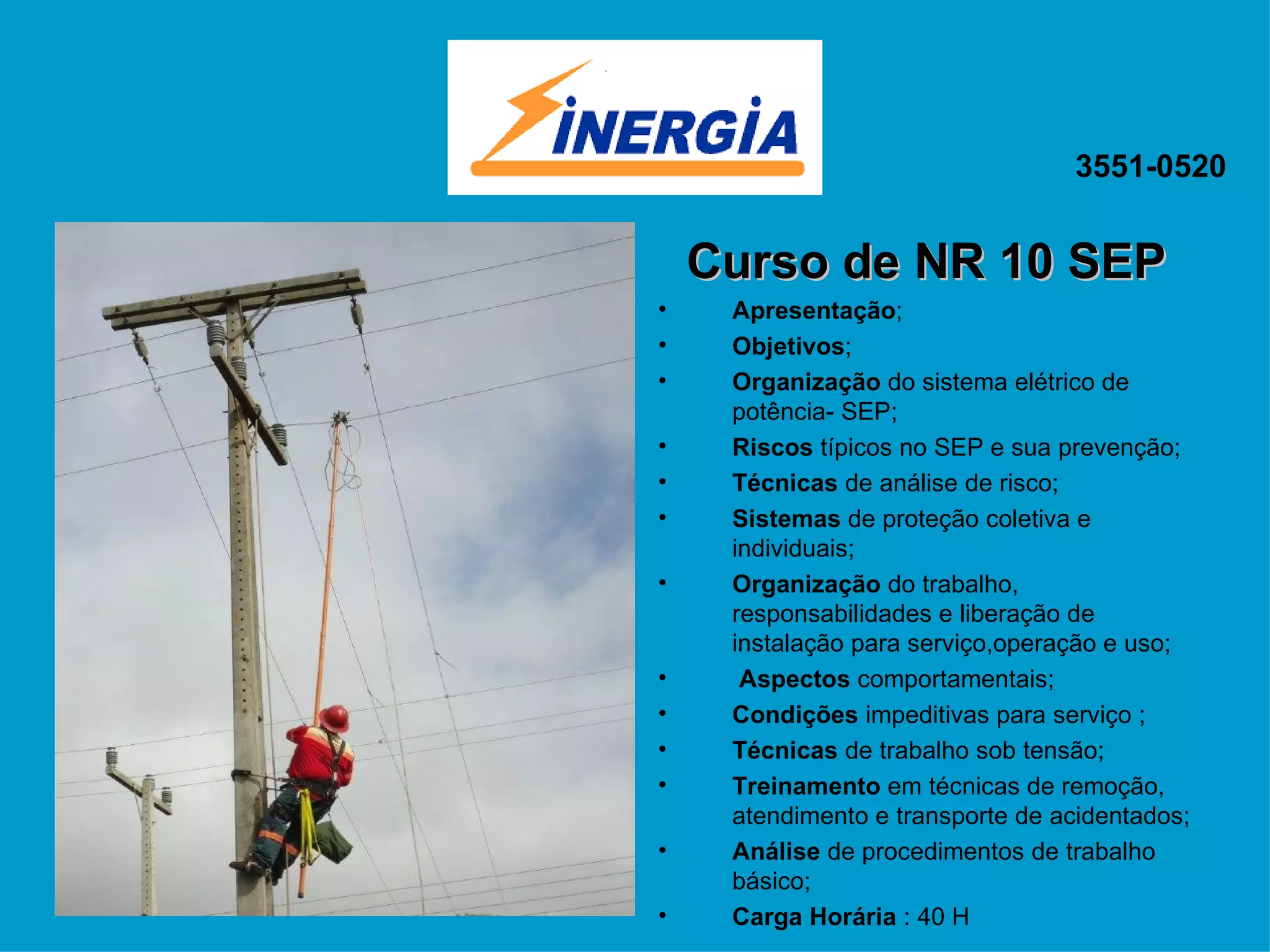 O curso de NR 10 apresenta os objetivos, riscos e técnicas de prevenção associados ao sistema elétrico de potência. Aborda tópicos como organização do sistema, análise de risco, proteções coletivas e individuais, organização do trabalho, condições de serviço e treinamento em remoção de acidentados. Tem duração de 40 horas.