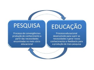 Este documento discute a importância da pesquisa no contexto educacional. Apresenta que a pesquisa deve ser um princípio metodológico básico para os professores desenvolverem uma compreensão crítica da realidade e proporcionarem aos alunos autonomia intelectual. Também defende que a pesquisa é fundamental tanto para os docentes quanto para os discentes, evitando o aprendizado mecânico e reprodutivo.