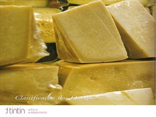 O documento discute os diferentes tipos de queijos, incluindo suas características, processos de fabricação e harmonizações com vinhos. Ele apresenta exemplos de queijos frescos, curados, brancos, moles, semi-moles e azuis, descrevendo suas propriedades sensoriais em degustações. Também recomenda literatura sobre queijos e vinhos.