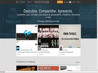 O SlideShare é uma plataforma online para compartilhar apresentações em slides, documentos, vídeos e outros conteúdos profissionais. Lançado em 2006, permite que usuários carreguem, armazenem e realizem buscas por materiais compartilhados. Publicar conteúdos relevantes no SlideShare pode ajudar a promover o perfil profissional do usuário e estabelecer redes de comunicação importante para empresas e profissionais independentes.
