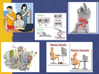 O documento discute doenças do sistema osteomuscular e do tecido conjuntivo relacionadas ao trabalho, incluindo LER/DORT. Ele descreve sinais e sintomas comuns dessas doenças, como dor e fraqueza muscular, e fatores envolvidos como aspectos biomecânicos, psicossociais e psicológicos. O documento também lista e explica brevemente várias patologias comuns, como tendinite, bursites e síndrome do túnel do carpo.