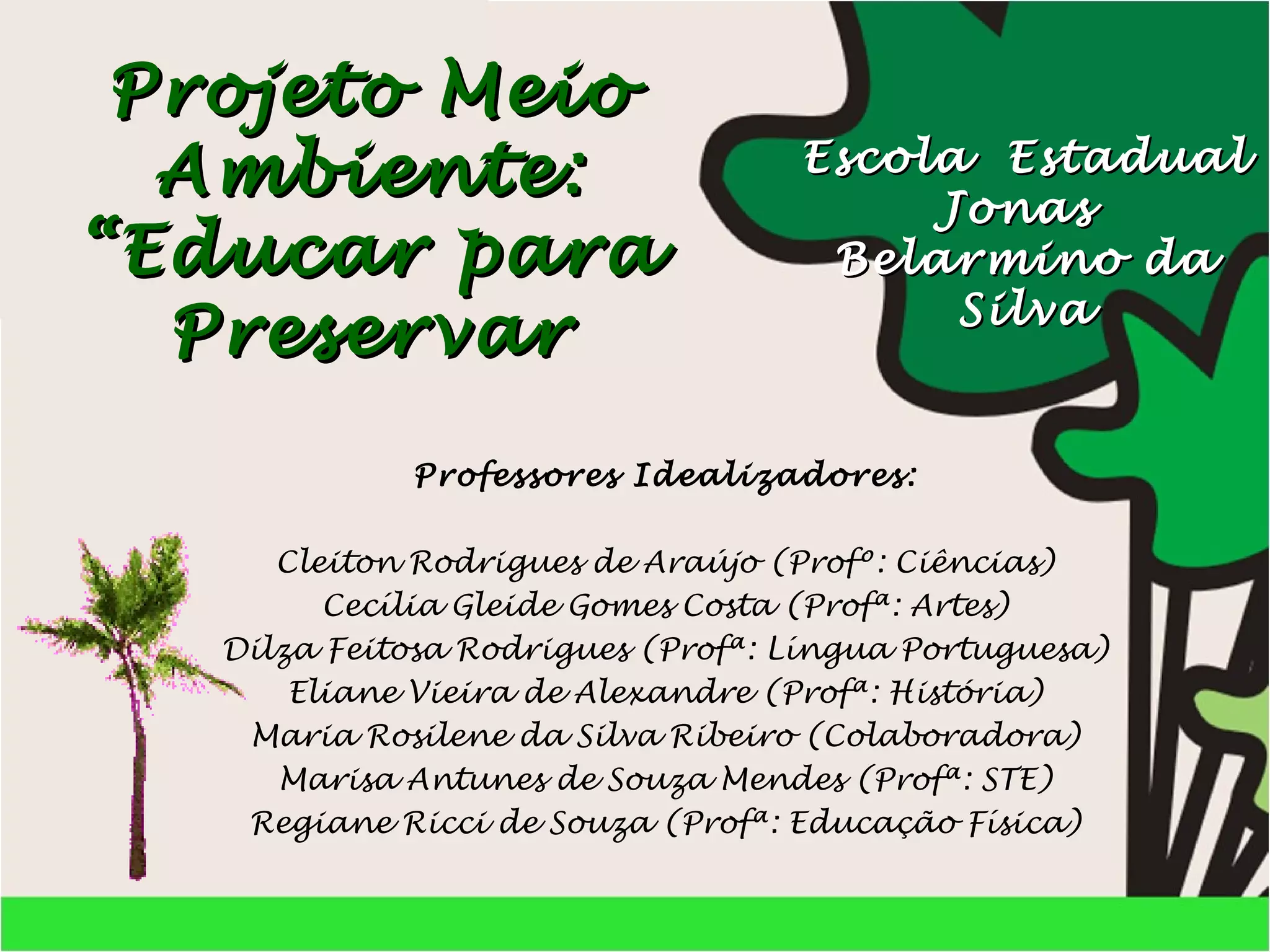 Este projeto foi idealizado por sete professores da Escola Estadual Jonas Belarmino da Silva e tem como objetivo conscientizar os alunos sobre a importância do meio ambiente, estimulá-los a perceber como as ações humanas impactam a natureza, e desenvolver atitudes éticas em relação ao meio ambiente. O projeto busca educar os alunos para que preservem o meio ambiente praticando a educação ambiental e adotando comportamentos como economizar água e energia e reciclar lixo.