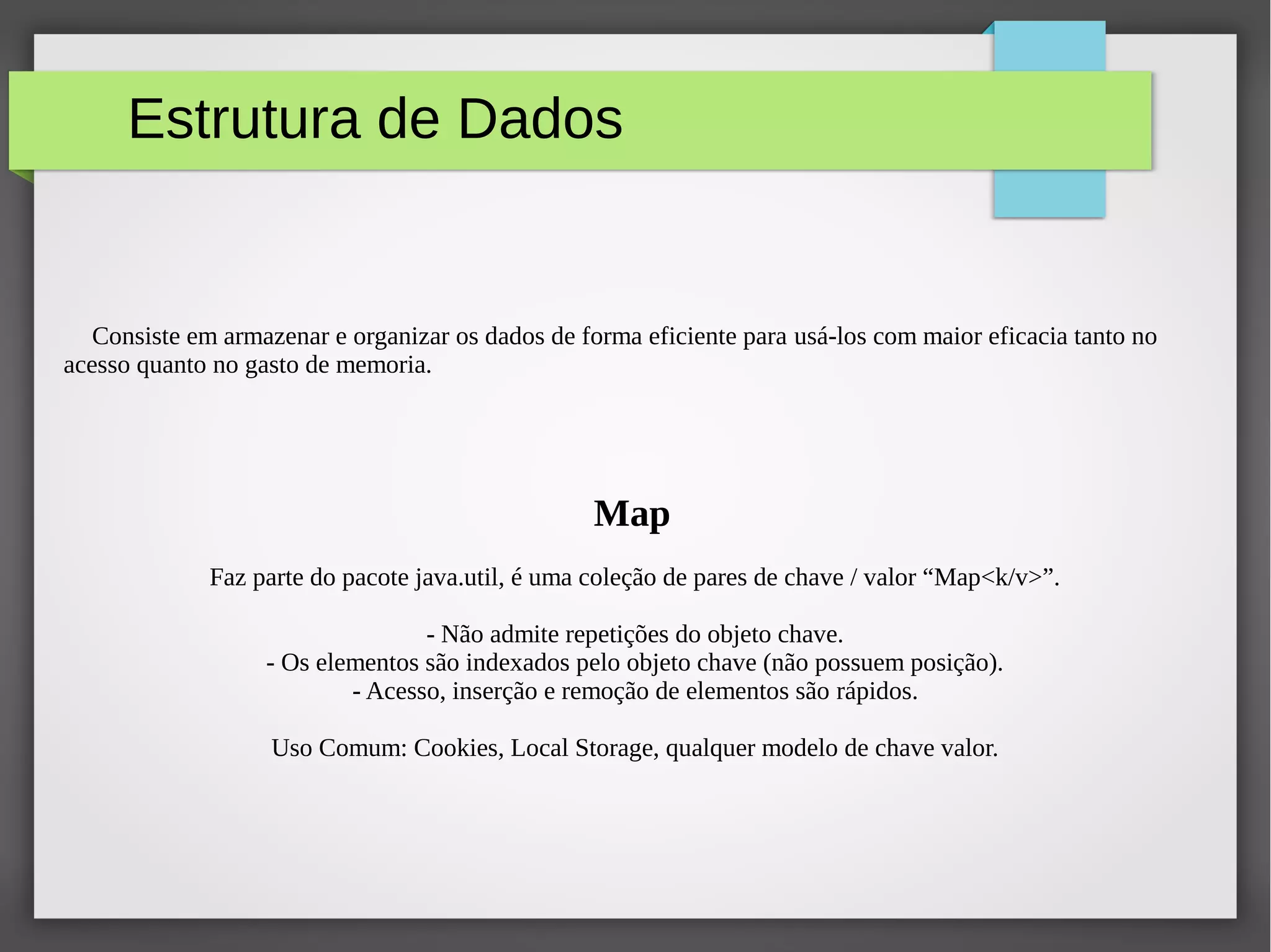 O documento descreve conceitos fundamentais de estruturas de dados em Java, incluindo Map, Set, Stack, Queue, Threads e mais. Map e Set são coleções que armazenam pares chave-valor e conjuntos de objetos respectivamente. Stack e Queue gerenciam dados de acordo com os modelos LIFO e FIFO. Threads permitem a execução paralela de tarefas.
