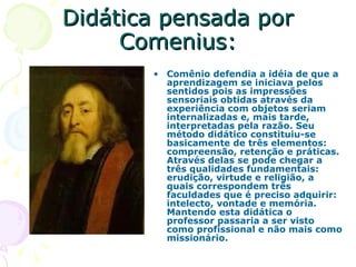 O documento discute as visões de Comenius, Dewey e Freinet sobre didática, definindo-a como interação, aprendizagem e troca de conhecimento. Apresenta também tendências pedagógicas como a liberal tradicional, a liberal renovadora progressiva e a progressista libertária. Conclui que didática é vida e está presente em nossas interações diárias.