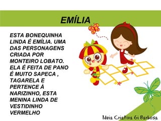 Monteiro Lobato foi um influente escritor brasileiro nascido em 1882 que criou a Turma do Sítio do Picapau Amarelo, incluindo personagens como Emília, Narizinho e Pedrinho. Ele contribuiu para dar cor e vida à literatura infantil brasileira através destes e de outros personagens de histórias.