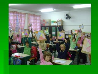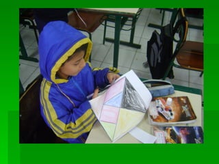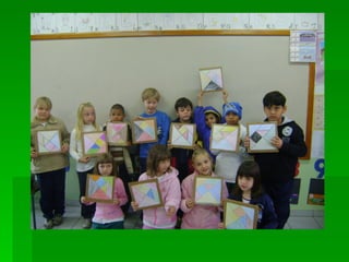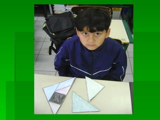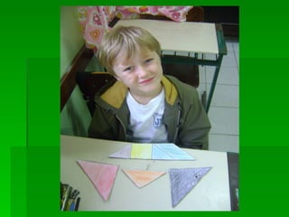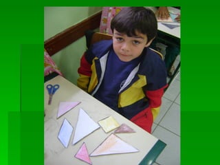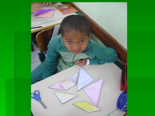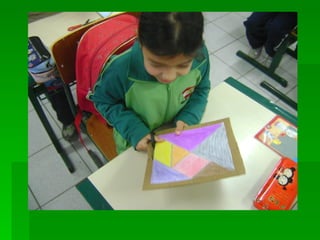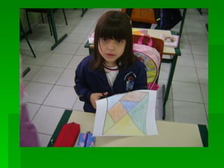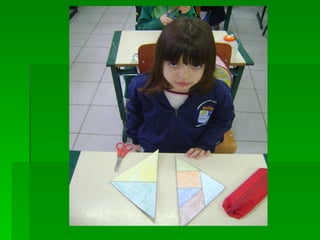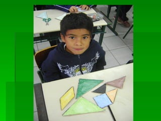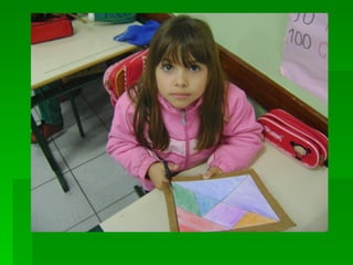 As instruções ensinam como pintar as peças de um tangram com cores diferentes, colar a folha em papelão para reforçar e recortar as peças para formar figuras utilizando as sete peças do quebra-cabeça tangram.