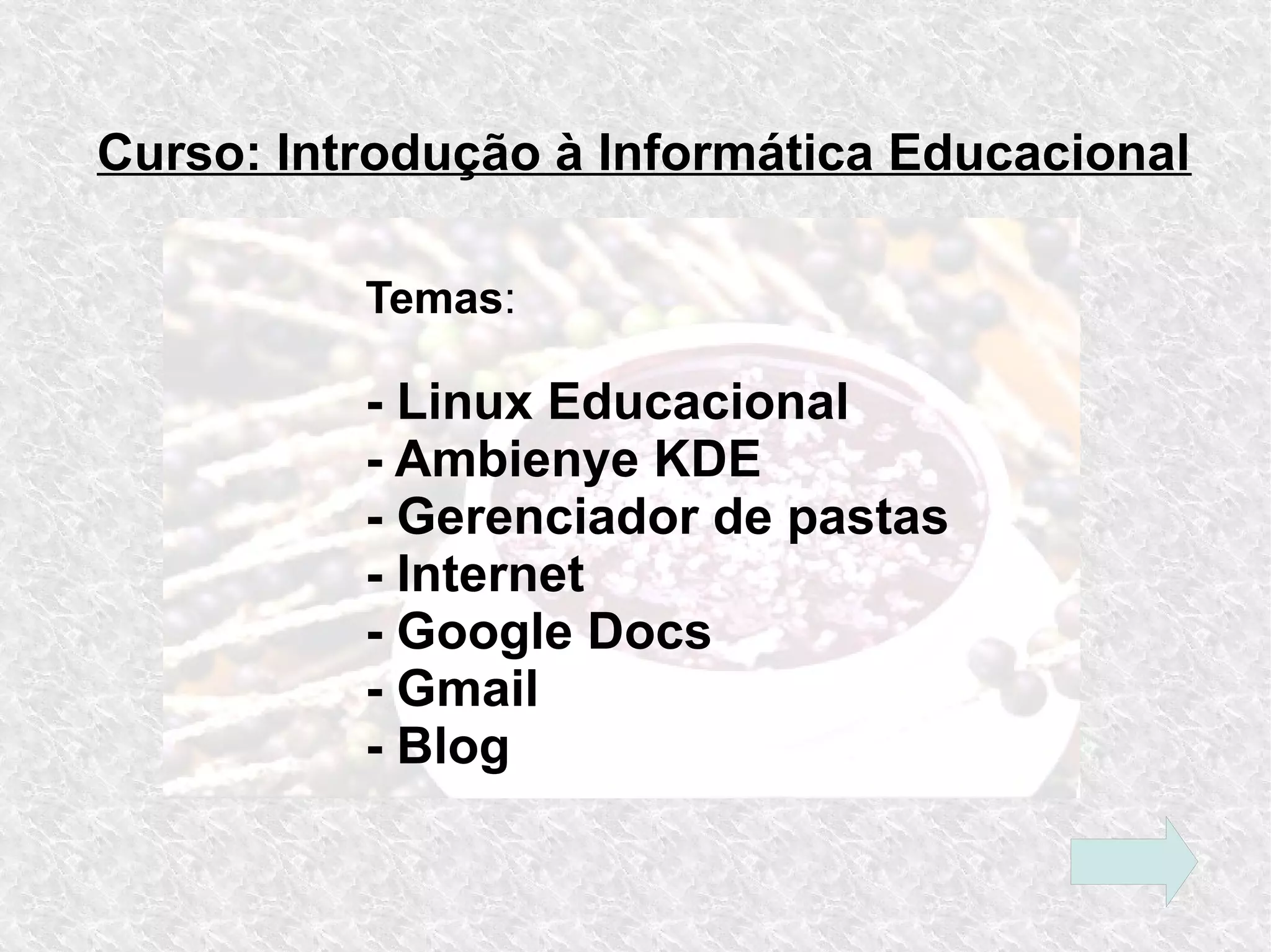O documento apresenta um curso introdutório de informática educacional que aborda temas como Linux, KDE, gerenciamento de pastas, internet, Google Docs, Gmail e blogs. O curso será ministrado em determinado local e período e utilizará recursos como imagem, tabela, gráfico e GIF animado para exemplificar os tópicos.