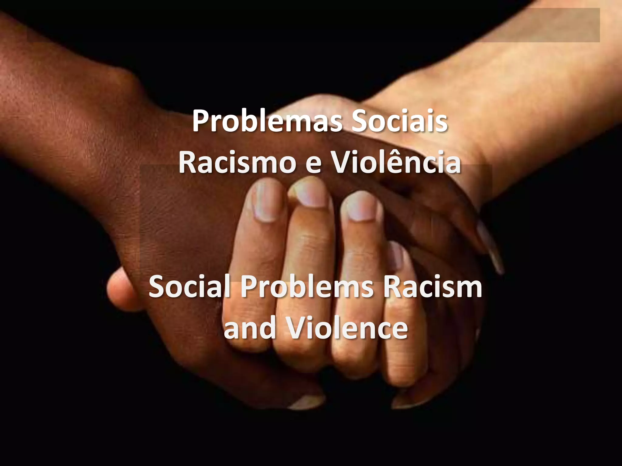 O documento discute os problemas sociais do racismo e da violência. Ele fornece definições de racismo e seus efeitos negativos, como a exclusão e danos mentais. Também discute como o racismo leva à discriminação no emprego e na escola. Dois heróis contra o racismo, Martin Luther King Jr. e Nelson Mandela, são destacados. Além disso, diferentes tipos de violência, como física, psicológica, verbal e sexual são definidos.