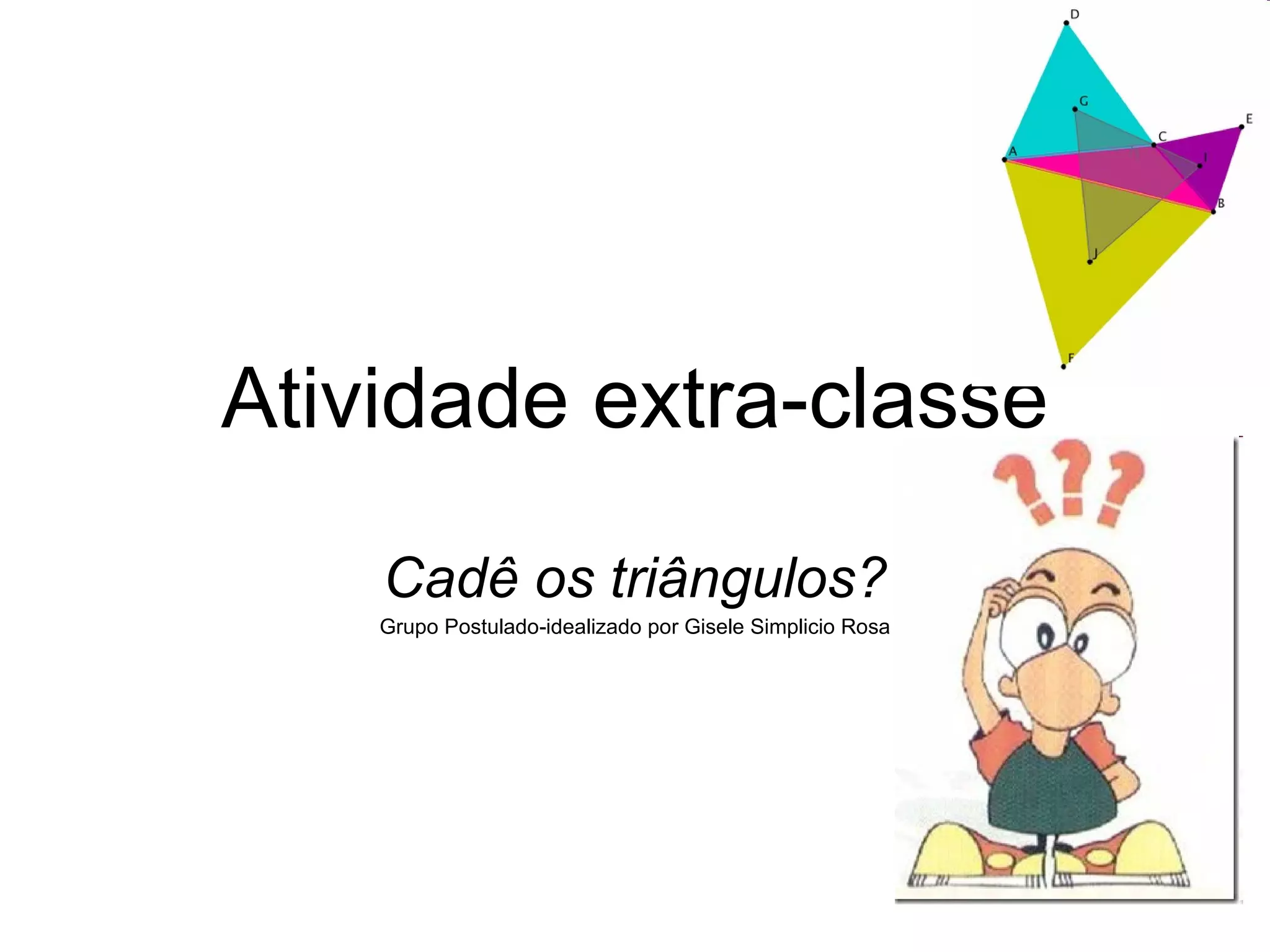 O documento discute um projeto escolar no qual estudantes tiraram fotos de triângulos em seu ambiente cotidiano e analisaram como esta figura geométrica é amplamente utilizada. Eles observaram triângulos em arquitetura, objetos, placas de trânsito e mais, notando suas aplicações e elementos. Após debate em grupo, concluíram que os triângulos estão presentes de muitas formas na paisagem e são úteis para entender outros polígonos.